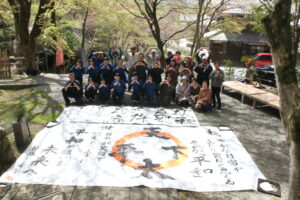 柏原高校書道部(白髭歩和里部長)が1日、世界平和を願い全国42会場で行われた平和揮ごうに参加し、石龕寺で奉納書道パフォーマンスをした。2.5m×5mの紙の中央に「天下泰平」と大書し、「世界中が笑顔に包まれるように」「穏…