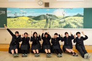 柏原高校美術部(足立千夏部長)の6人が、福知山高校が行っている「アフター大河バトンプロジェクト」に参加し、昨年2月まで放送されていたNHK大河ドラマ「麒麟がくる」をテーマに、柏原高校内の教室で黒板アートを制作。黒井城跡…